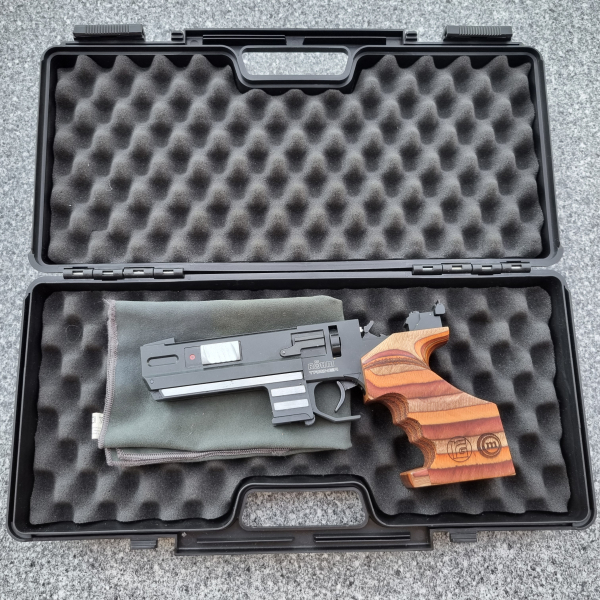 Die Waffe hat einen Schichtholzformgriff Größe M. Dabei sind 4 Trommeln 8 Schuss und ein Einzelschussadapter.