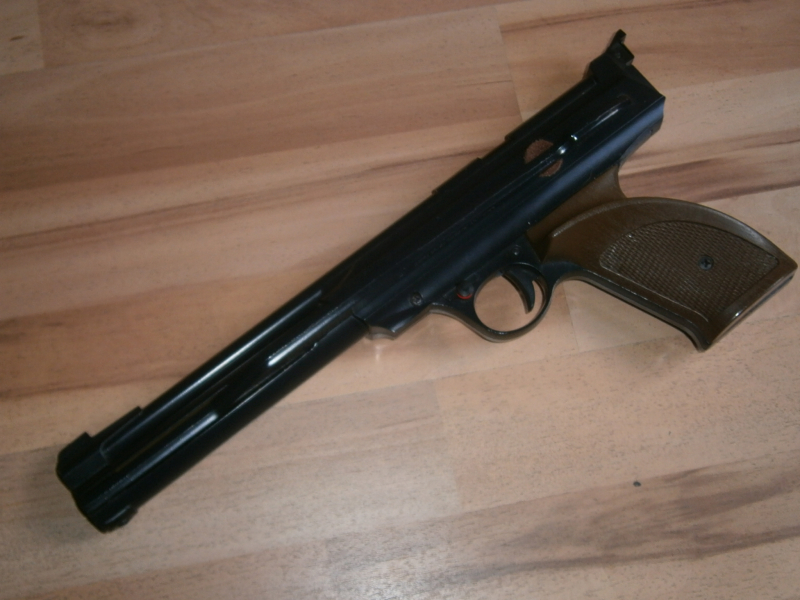 Hallo zusammen, biete euch eine einschüssige Seitenspanner Vorkompremierpistole im Kal.4,5mm von Daisy. Der gezogene Stahllauf ist 245mm lang. Einzigstes Manko ist, das die voll einstellbare Kimme rechts abgebrochen ist (siehe Bild3). Ansonsten funktioniert sie einwandfrei, und ist technisch wie optisch im sehr gutem Zustand. F im 5eck & BKA Stempel vorhanden. Bei Fragen, gerne mailen