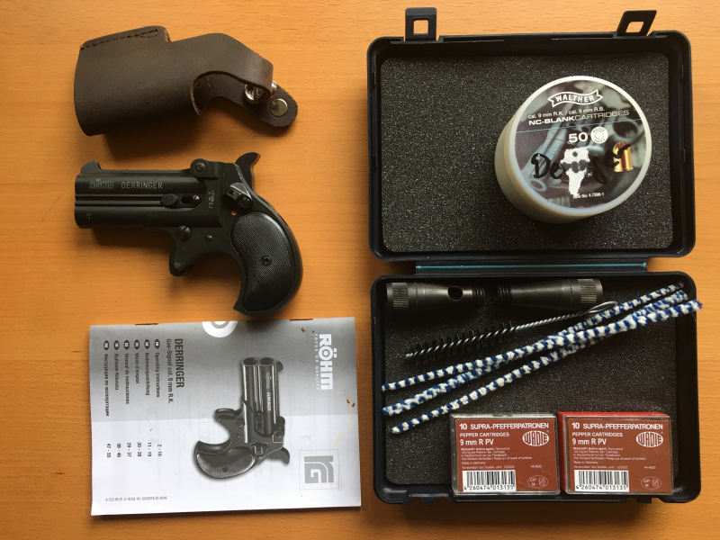 1 x Röhm Deringer, Schreckschuss, 2 Läufe, incl. Originalzubehör