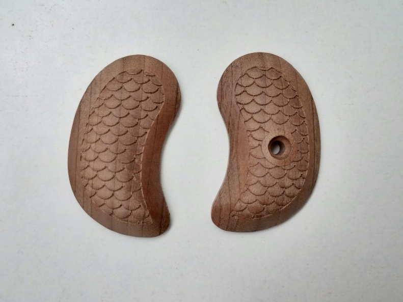 Die Griffschalen haben Fischschuppen-Gravur und sind unversiegelt auf der Oberfläche, damit der Verbraucher die Griffschalen nach seinem eigenen Wunsch färben (beizen), ölen oder wachsen kann.