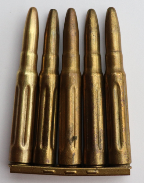 Ladestreifen mit fünf Exerzierpatronen S 1933 und 1934 auf Ladestreifen Zustand siehe Bild. Ladestreifen gestempelt P25. Privatverkauf aus Sammlung, keine Garantie oder Gewährleistung und keine Rücknahme.