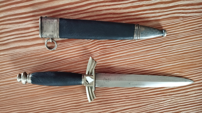 Verkauft wird ein DLV/NSFK- Fliegermesser mit Herstellermarkung SMF Solingen in Feinzinkausführung/ Neusilber/ Nickel. Klinge ist in gutem Zustand, Herstellerlogo gut zu erkennen. Alle Schrauben sind vorhanden sowie auch das "K" auf der Parrierstange und Markung auf dem Mundblech. Symbole sind beide vorhanden, original und gut erhalten. Das Leder wurde sicherlich erneuert.