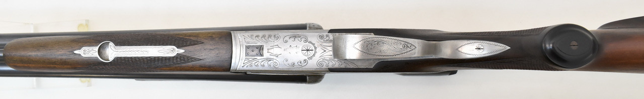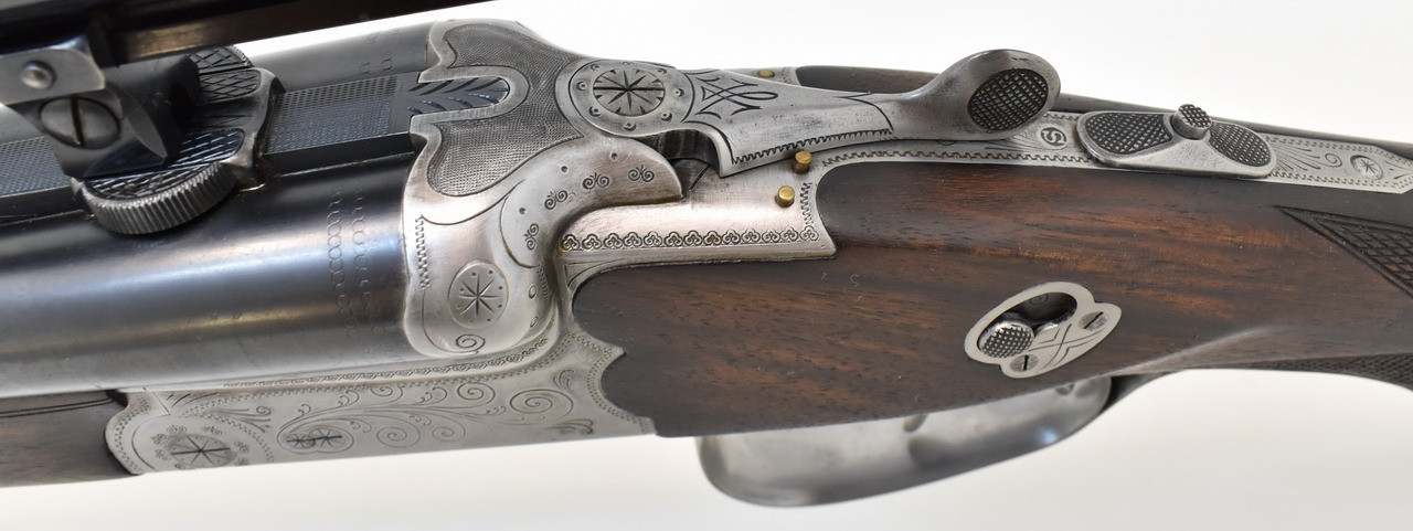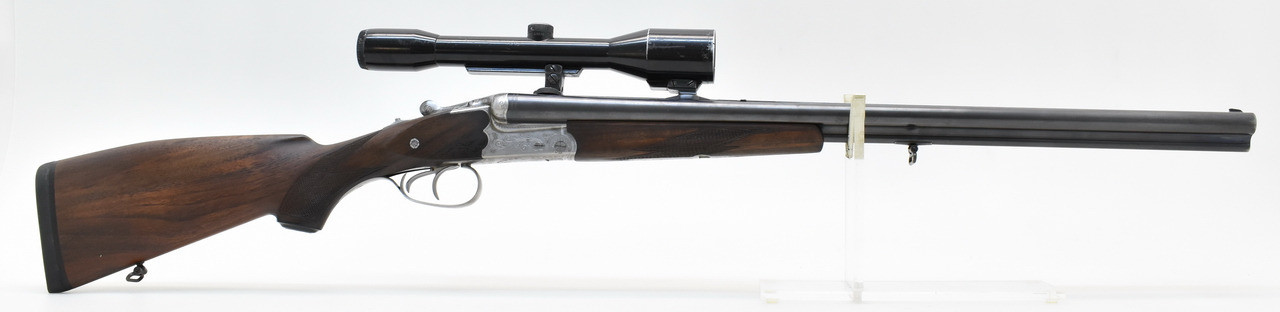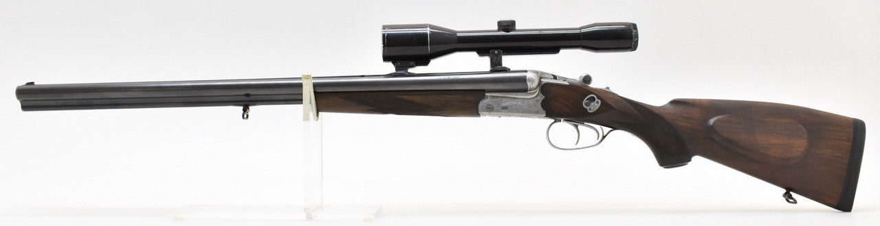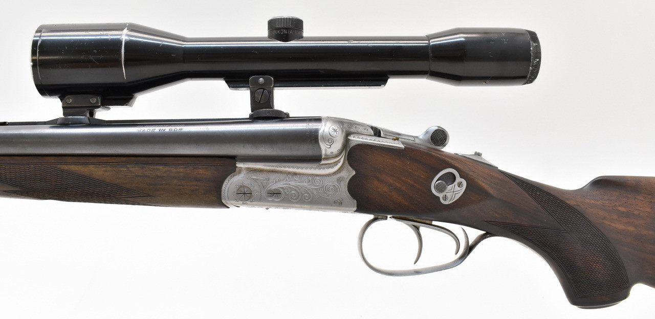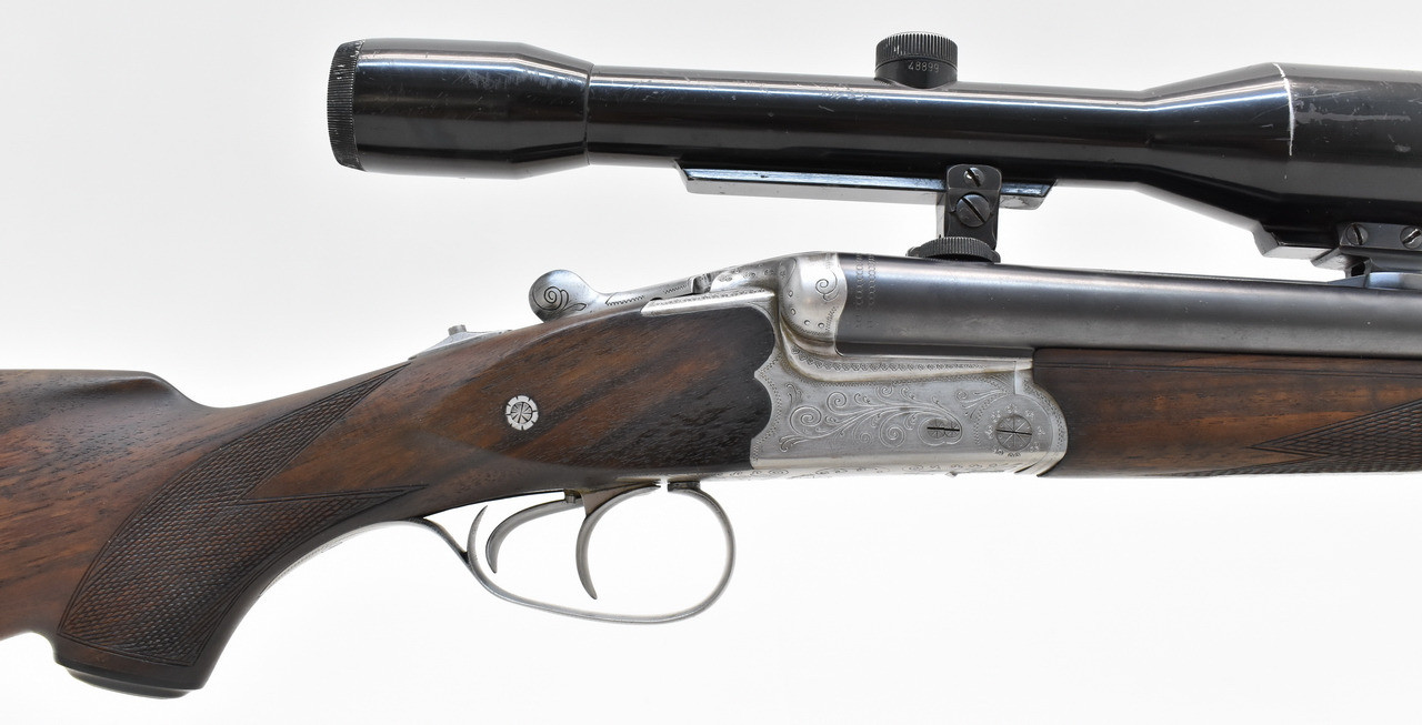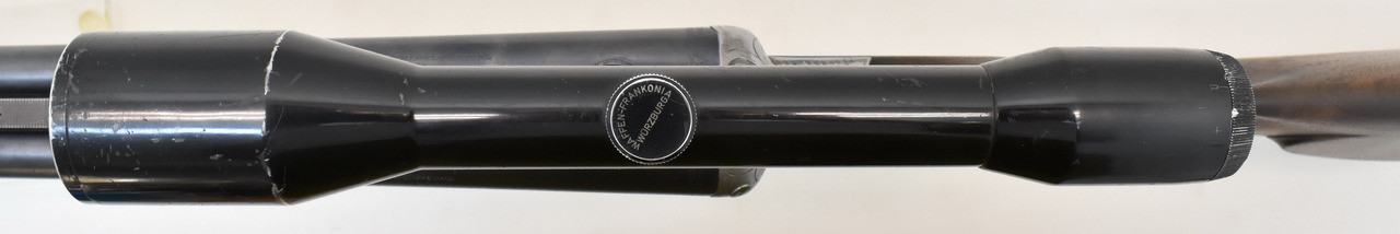 Stahlsystemkasten mit kleiner Arabeskengravur. Französischer Rückstecher im vorderen Abzug. Läufe aus Special Gewehrlaufstahl. Die Waffe ist auf einer SEM mit einem Frankonia ZF 6x42 Abs. 1 montiert. Dichter Verschluss, rechter Schrotlauf stellenweise rau. Die anderen Läufe sind blank. Beschuss von 03/71. Schaftlänge 36,5cm gemessen vom vorderen Abzug bis Mitte Schaftkappe.