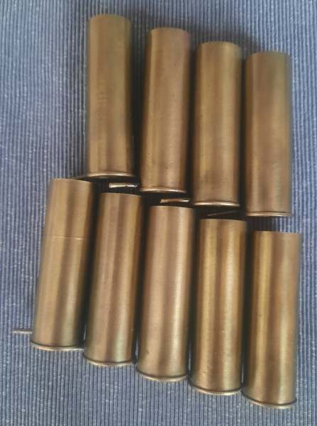 ich biete 9 Stück Messinghülsen Kal. 16 im System Lefaucheux an. Die Hülsen haben eine Länge von 60 mm. Sie wurden nur einmal abgeschossen, jetzt wurden Sie innen gereinigt und neu gezündert. Die Schlagstifte wurden mit Lack abgedichtet. Fertig zum Wiederladen.