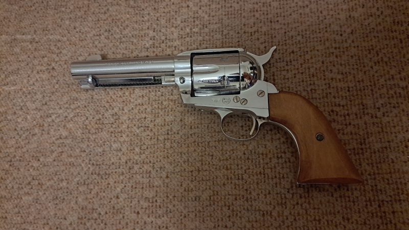 Biete einen verchromten Texas Scout "Frontier" in der kurzen Gunfighter-Ausführung mit 4,75 Zoll Lauf. Keine Abplatzer im Chrom. Satter Schlossgang. Am Ansatz des Korns etwas unsauber eingesetzt. Fast nicht zu sehen. Habe den SAA nicht geschossen und habe ihn auch so gekauft. Ein tolles Teil!