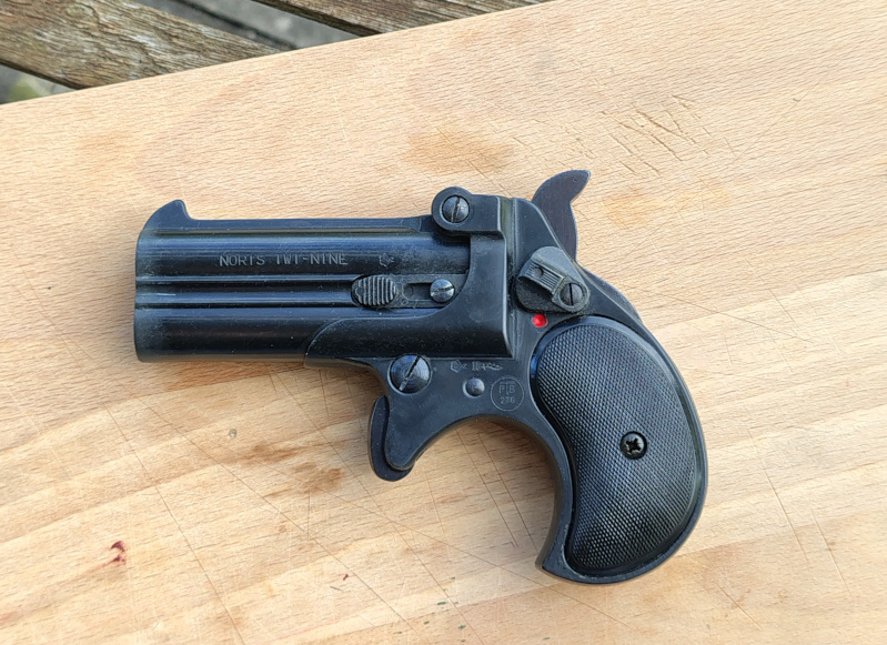 Deringer in gutem Zustand, voll funktionsfähig. Normale Schmauchspuren vorhanden. Laufsperren vorhanden, hier wurde nichts rumgefummelt. Lauf in Gegensatz zu späteren Fertigungen noch leicht zu entfernen, da nur durch einen Bolzen mit Gewinde befestigt.