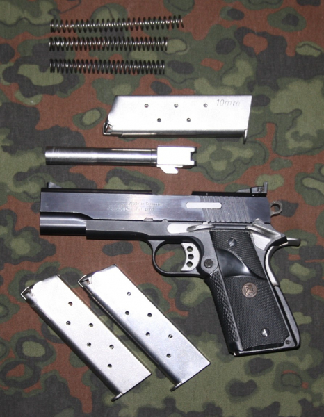 Sie bieten auf eine 1911er Sportpistole von Peters Stahl Modell "Multicaliber" im Kal. .45ACP mit Wechsellauf im Kal. 10mm Auton. Alles im schönen Zustand mit nur leichten Gebrauchsspuren. Die Waffe stammt aus Erstbesitz und wird aus Altersgründen verkauft. Lauf und Funktion einwandfrei.