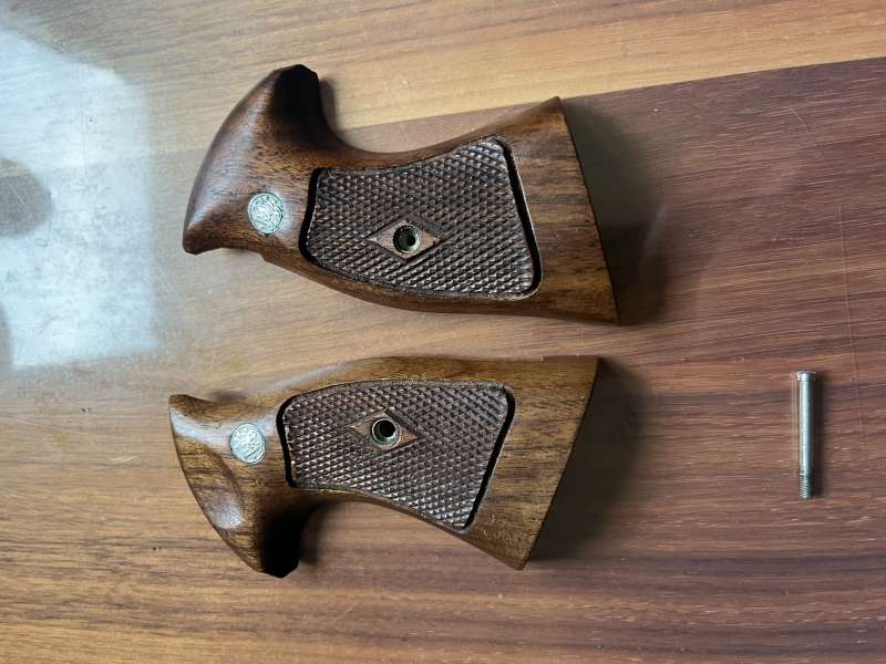 Zum Verkauf kommen seltene Holzgriffschalen original von Smith & Wesson aus den 1960’er Jahren, sogenannte Diamond Griffe, für den K-Rahmen, mit Schraube. Zustand siehe Fotos, Privatverkauf, keine Garantie oder Rücknahme, Versandkosten innerhalb der EU bitte anfragen.