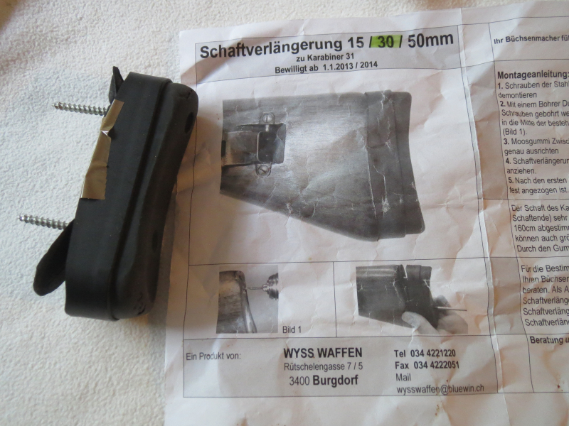 Hier gebe ich eine Schaftverlängerung für Schweizer K31 ab. 30mm, guter Zustand. Die Vollgummikappe hat nach jahrelangem Gebrauch Abnutzungsspuren(s.Foto), die aber auf die Funktion des Artikels keinen Einfluß haben. Kostet in der Schweiz ca.155sfr.