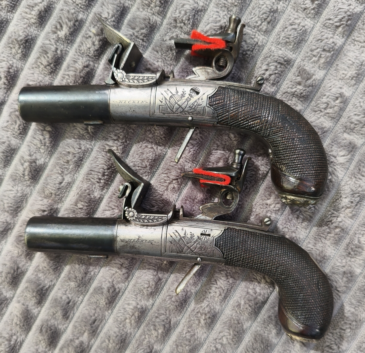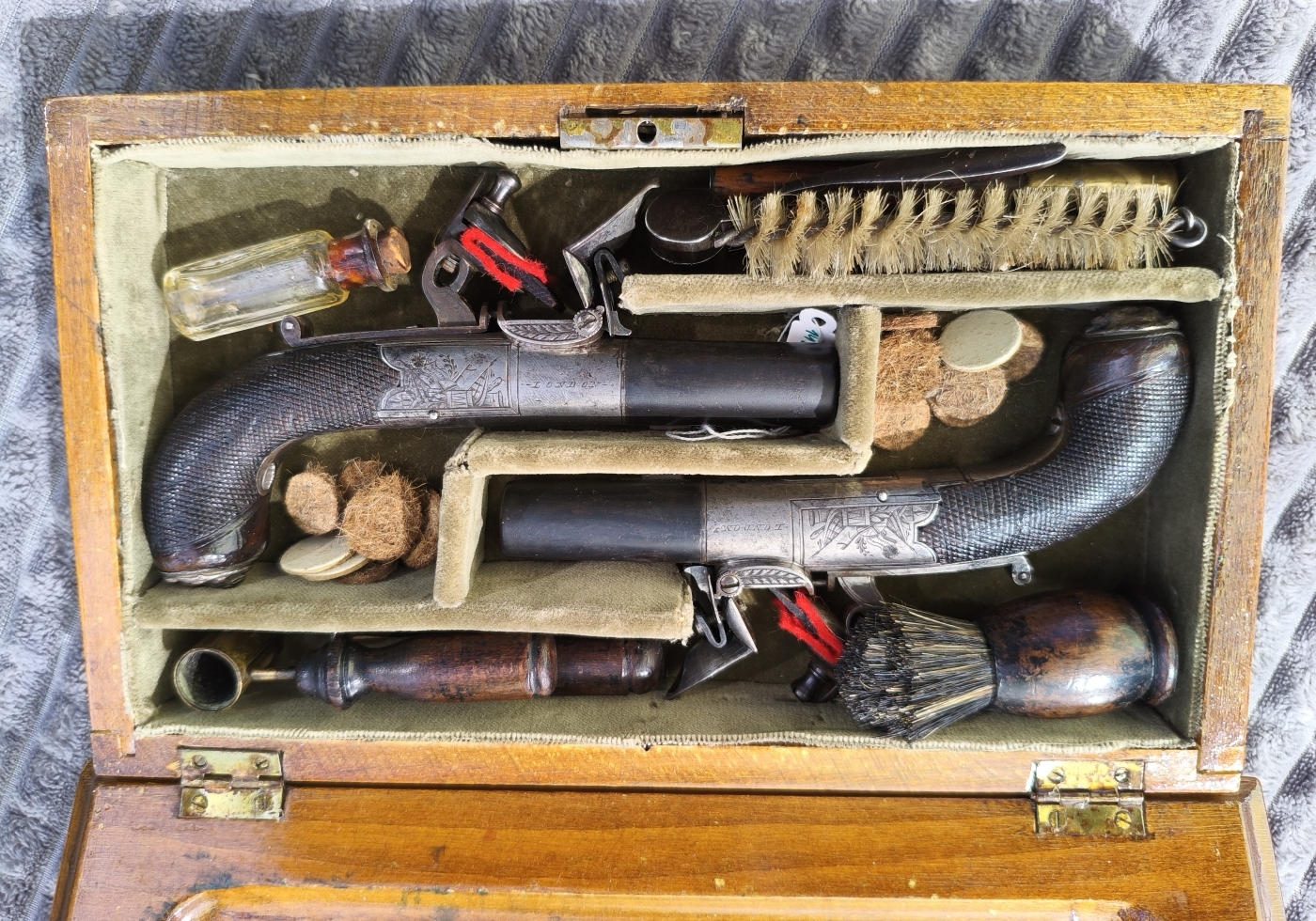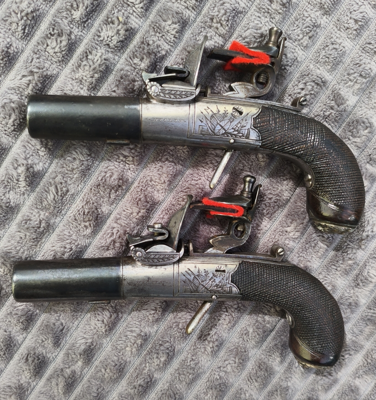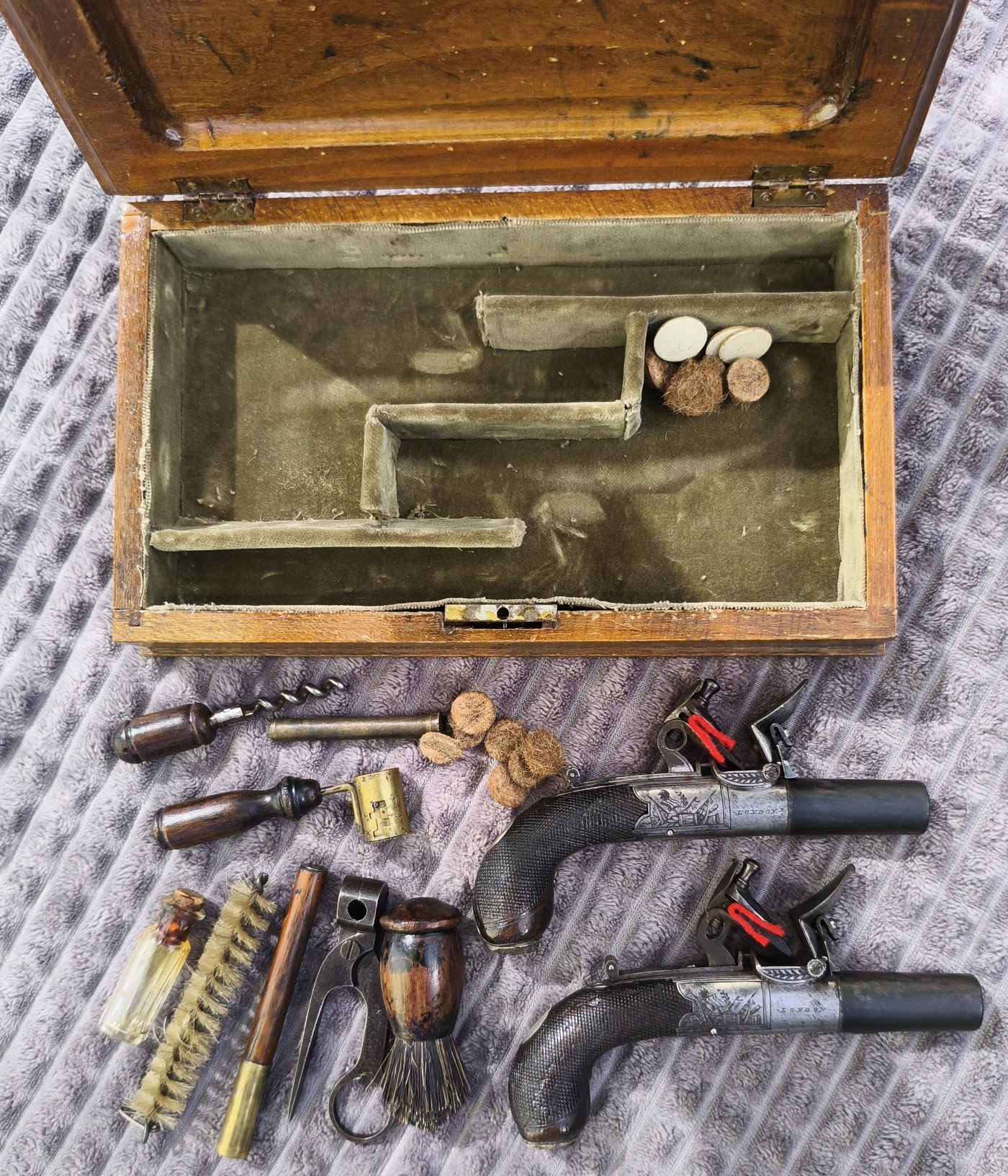 Runde gebläute Läufe, abschraubbar, Kaliber circa 12,5mm. Runde fein gravierte Schloßkästen, Büchsenmacherangabe sowie London, zwei Beschussstempel. Zwei Rasten, gute Funktion. Verstellbare Pfannendeckel. Pfanne beidseitig graviert. Schiebesicherung. Gewaffelte runde Griffe. Monogrammplatte in Silber sowie Abschluß mit Löwenkopf. Gesamtlänge 15,3cm. In alter Nussholzkassette, abschließbar/Schloss etwas gelockert/Schlüssel fehlt. Reichlich Zubehör wie passende Kugelzange, Ölflasche, Putzer usw. Maße Kassette 26cm x 15,2cm. Höhe 50mm.