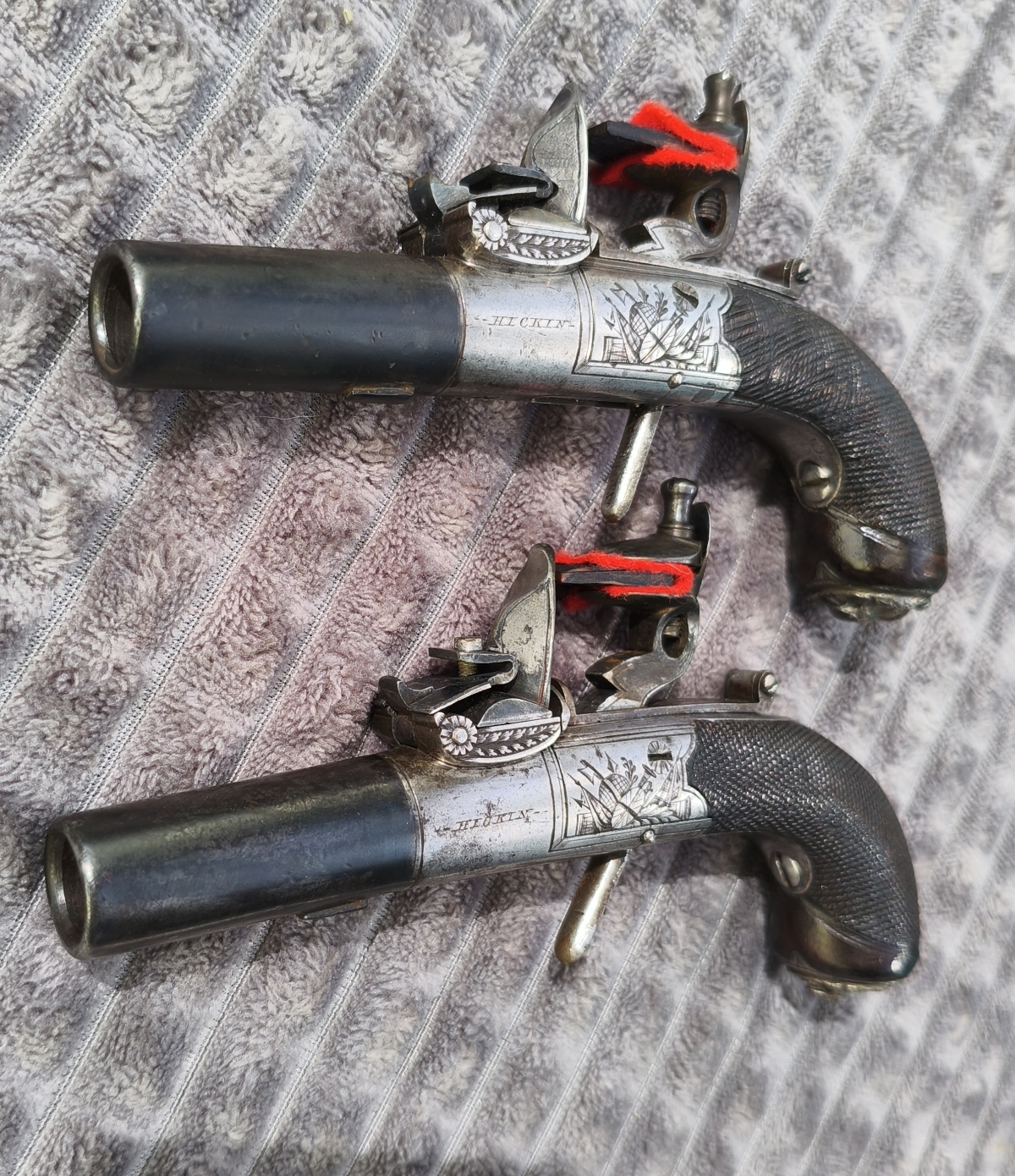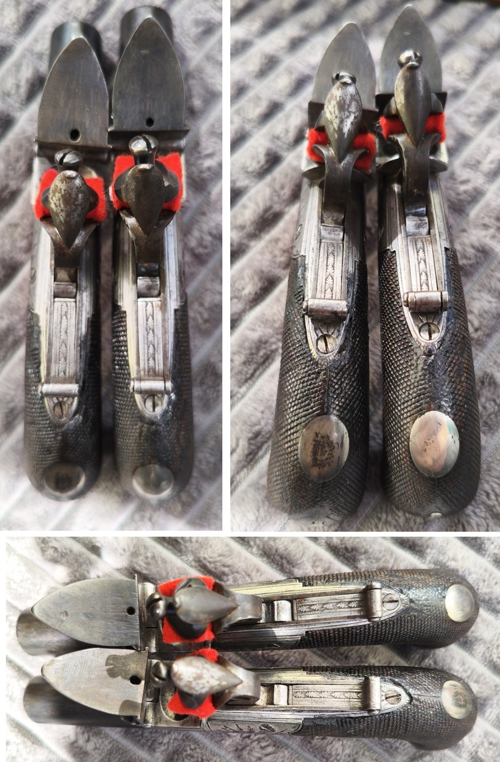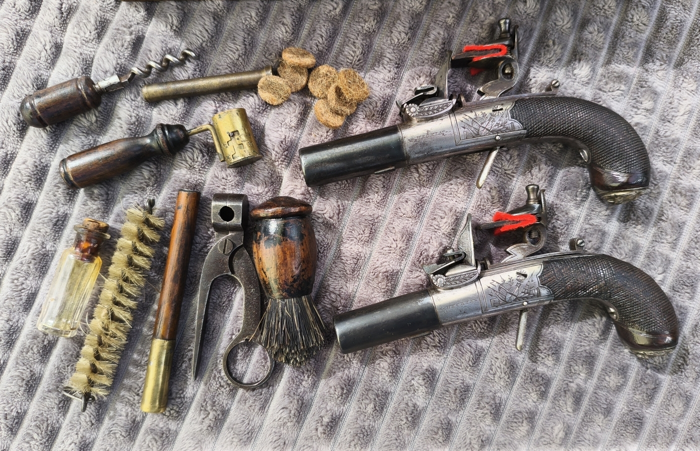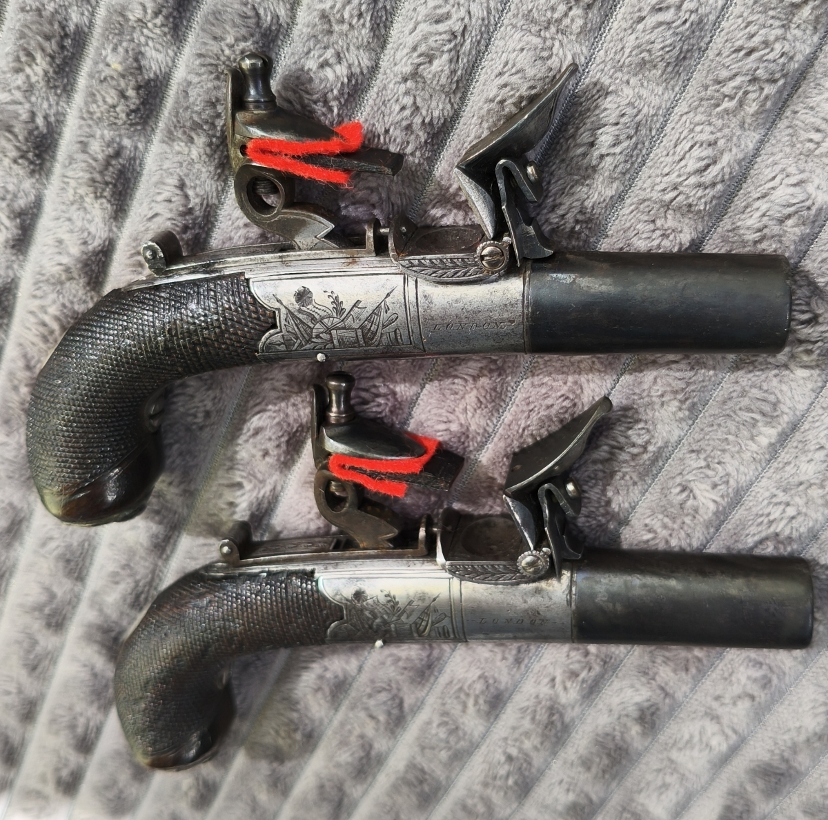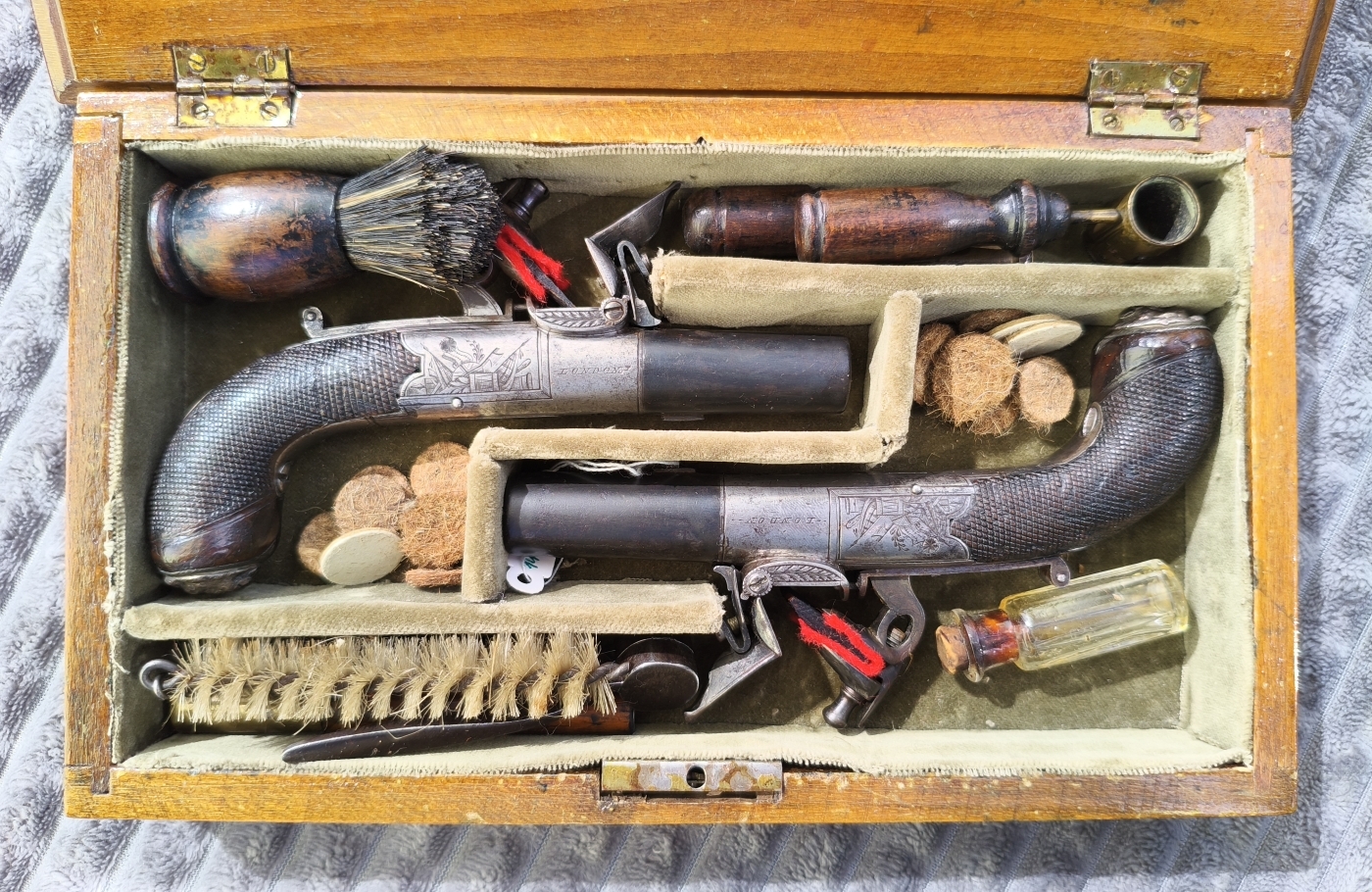 Runde gebläute Läufe, abschraubbar, Kaliber circa 12,5mm. Runde fein gravierte Schloßkästen, Büchsenmacherangabe sowie London, zwei Beschussstempel. Zwei Rasten, gute Funktion. Verstellbare Pfannendeckel. Pfanne beidseitig graviert. Schiebesicherung. Gewaffelte runde Griffe. Monogrammplatte in Silber sowie Abschluß mit Löwenkopf. Gesamtlänge 15,3cm. In alter Nussholzkassette, abschließbar/Schloss etwas gelockert/Schlüssel fehlt. Reichlich Zubehör wie passende Kugelzange, Ölflasche, Putzer usw. Maße Kassette 26cm x 15,2cm. Höhe 50mm.