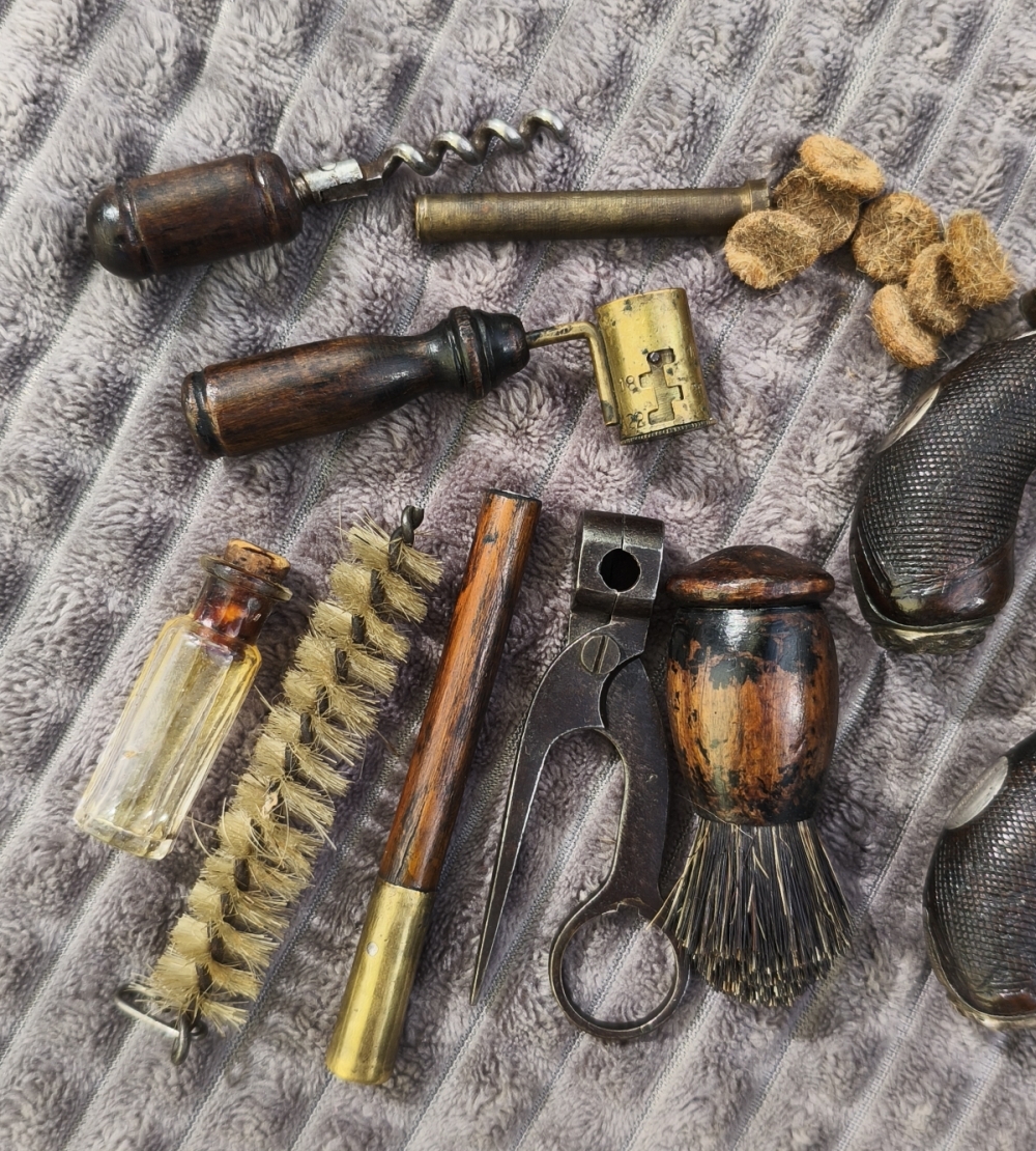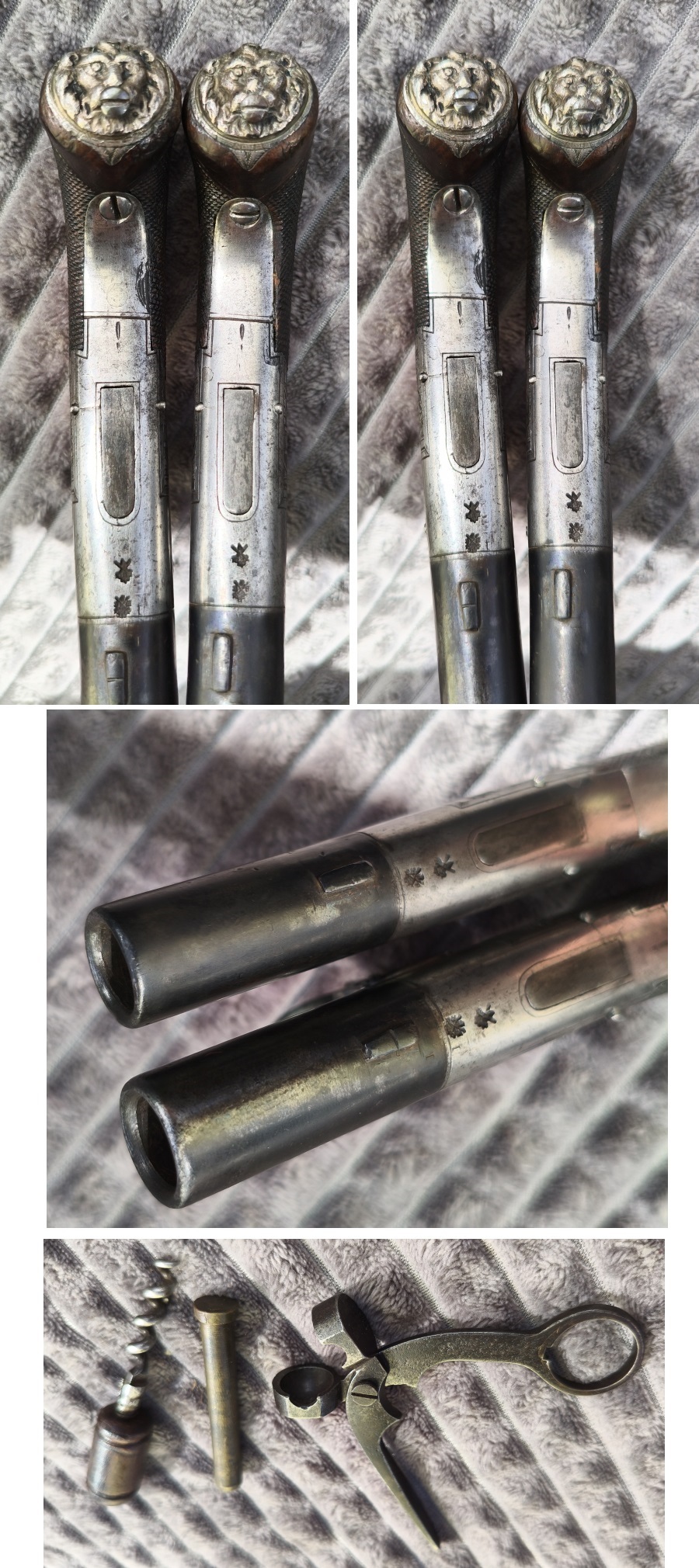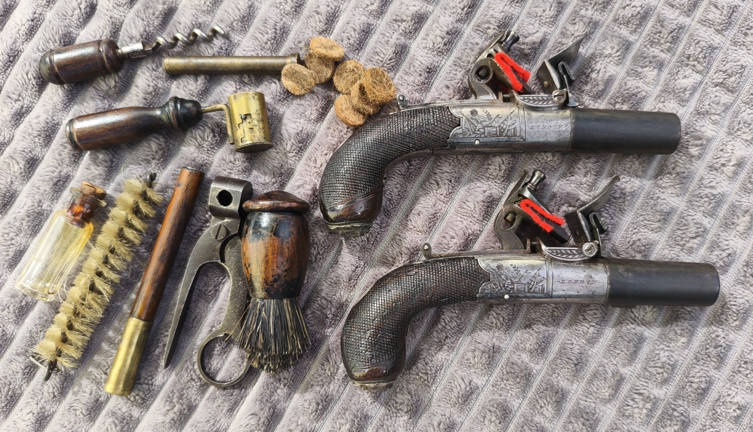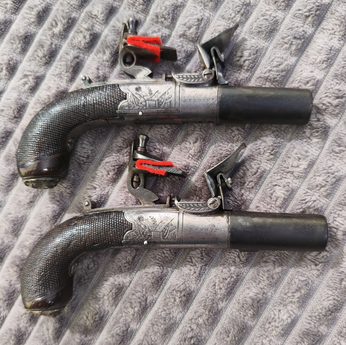 Runde gebläute Läufe, abschraubbar, Kaliber circa 12,5mm. Runde fein gravierte Schloßkästen, Büchsenmacherangabe sowie London, zwei Beschussstempel. Zwei Rasten, gute Funktion. Verstellbare Pfannendeckel. Pfanne beidseitig graviert. Schiebesicherung. Gewaffelte runde Griffe. Monogrammplatte in Silber sowie Abschluß mit Löwenkopf. Gesamtlänge 15,3cm. In alter Nussholzkassette, abschließbar/Schloss etwas gelockert/Schlüssel fehlt. Reichlich Zubehör wie passende Kugelzange, Ölflasche, Putzer usw. Maße Kassette 26cm x 15,2cm. Höhe 50mm.