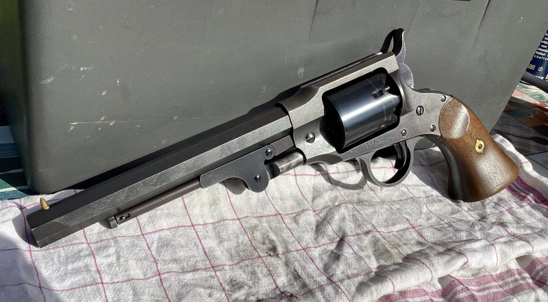 Angeboten wird ein Perkussionsrevolver Rogers & Spencer von Feinwerkbau. Niedrige dreistellige Herstellungsnummer, Topp Verarbeitung, heutzutage unerreicht. Trocken stehender Abzug. Wurde stets pfleglich behandelt, gereinigt und eingeölt. Der Trommelspalt ist selbst bei Gegenlicht (fast) nicht auszumachen, so genau ist er gearbeitet.
