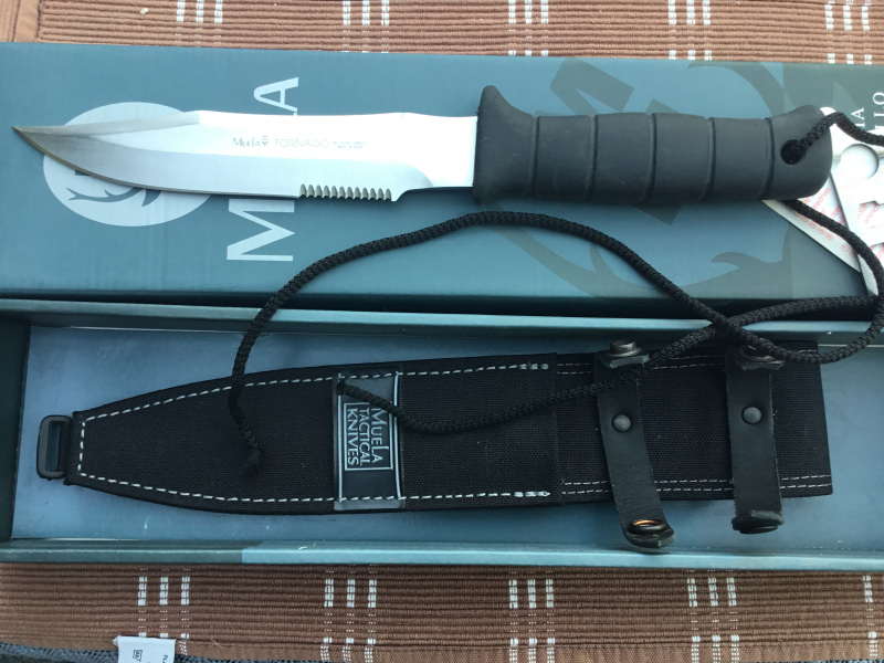 Muela Tornado,ein großes Messer mit einer Klinge von ca 18,3 cm,sehr schön geformt.Ich habe es nie genutzt,nur zum Ansehen gelegentlich ausgepackt.Leichte Schleifspuren sind dadurch entstanden,für Interessierte wahrscheinlich kein Problem zu entfernen sollte dies stören.Der Griff ist gummiartig und somit rutschfest,er misst ca 13,3 cm und scheint falsch herum angebracht,mich hat es nie gestört da es trotzdem sehr gut in der Hand liegt.Für Freunde von großen Messern,dazu noch vom Qualitätshersteller Muela eigentlich ein Muss bei dem Preis.Das Set ist vollständig wie auf den Bildern ersichtlich.