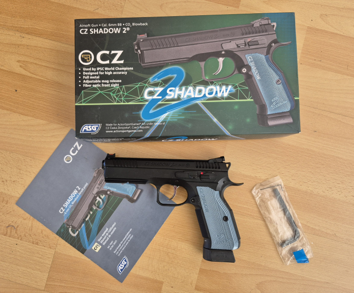 Ich löse meine CO2-Sammlung auf, hier eine schöne ASG CZ Shadow 2 mit metallicblauen Griffschalen. Eine tolle Waffe, natürlich Vollmetall. Inklusive Originalverpackung, Inbusschlüssel und ein paar BBs.