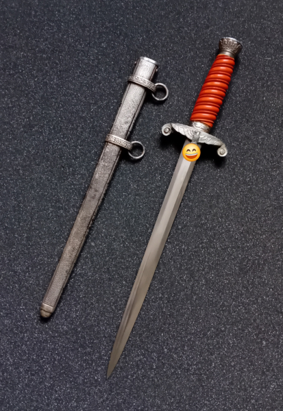 Zur Auktion steht dieser Offiziersdolch des Heeres. Die blanke Klinge und Scheide sind magnetisch. Die Trageringe sind geschlossen. Die Klinge hat keinen Hersteller, aber eine Schmiedemarke ( siehe Foto ). Die gleiche Marke haben Klingen von Alcoso Solingen. Der Adler wurde mal vom HK getrennt, aber vom Vorbesitzer wieder recht gut repariert. Mehr kann ich zu dem Dolch nicht sagen. Insgesamt sind Alters/Gebrauchsspuren vorhanden.