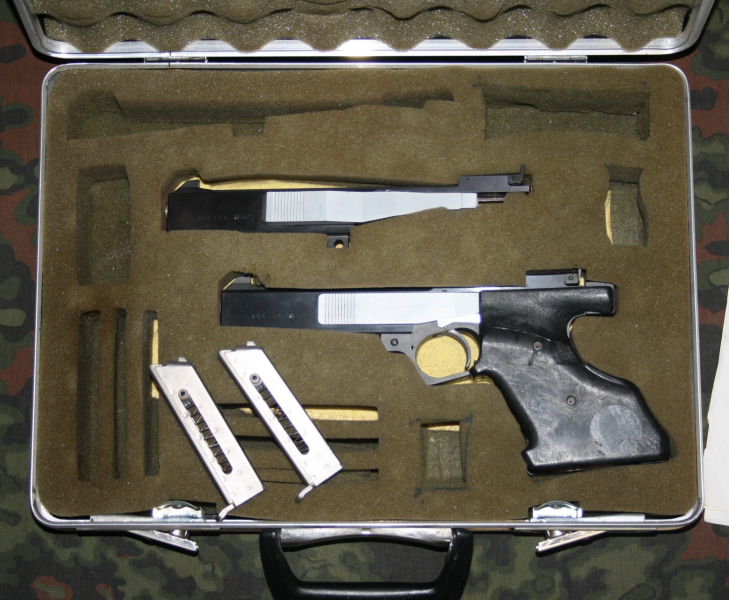 Aus Erstbesitz stammt diese KK-Matchpistole SAKO "Tri Ace" im Kal. .32. Inkl. Wechselsystem im Kal. .22lfb. Alles im Koffer und im guten Zustand mit normal üblichen, leichten Gebrauchsspuren. Läufe und Funktion einwandfrei. Selten im Angebot!