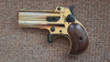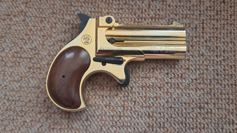 Biete einen Röhm Derringer in Gold. Er hat vorne an der Mündung und am Griffrücken kleine Macken, als ob er mal runtergefallen wäre. Ist auch mit geschossen worden. Diese Spuren sind aber nur aus der Nähe zu sehen. Daher zum Tragen auf Westernevents oder zum "Spielen" geeignet.