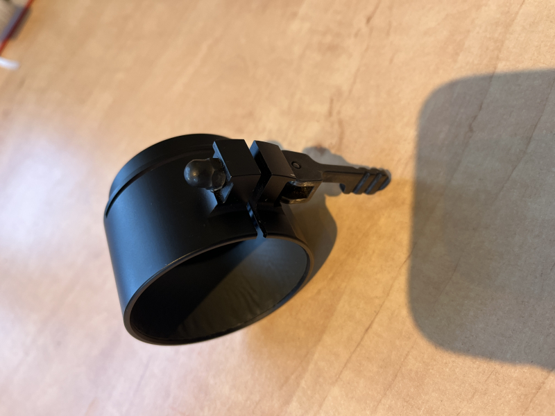 Klemmadapter für Zielfernrohr mit 56mm Außenduchmesser (z.B. Zeiss V8 1,8-14x50) mit M52x0,75 Gewinde. Zurzeit ist noch ein Reduzierring auf M49x0,75 für Dipol eingesetzt, kann aber einfach rausgedreht werden.