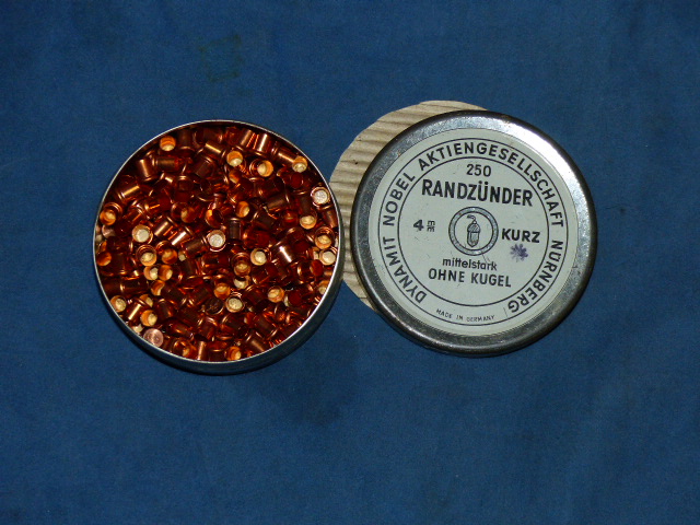 Biete eine Dose Dynamit Nobel 4mm Randzünder Patronen ohne Kugel. Habe nicht nachgezählt, sollten aber voll sein (siehe Bild).