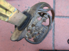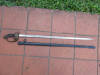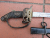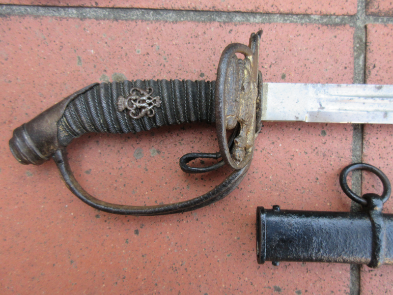 78 cm lange und 22 mm breite Degenklinge, beidseitig 2 schmale Hohlkehlen, vernicklelt, gute Erhaltung, Eisengefäß mit mittels Scharnier ein und ausklappbarem Handschutz, darauf Medaillon mit dem Preussischen Adler, Originale Kriegsvergoldung, diese abgerieben, Gehölze mit Fischhaut ummantelt, diese original und unbeschädigt, originale Griffwicklung, aufgelegtes Emblem mit Initial Kaiser Willhelm II ( KW II )und Krone, Gesamtlänge : 92 cm. Eisenscheide, keine Dellen, leichtere Rostnarben. Porto Österreich 10 Euro, E-U Länder 19 Euro
