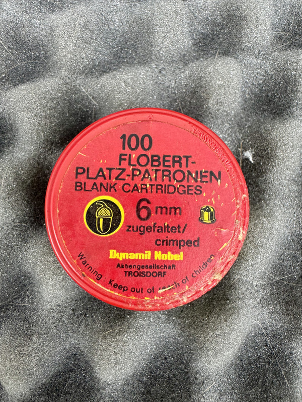 Eine Originalschachtel mit Flobert-Platz-Patronen im Kaliber 6mm der Marke Dynamit Nobel.