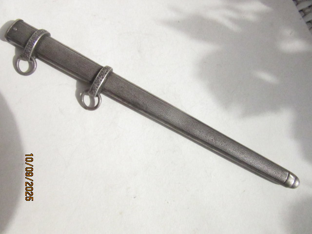 Diese Auktion läuft nur drei Tage. Diese originale Scheide ist in hervorragendem Zustand. Kein Rost keine Dellen keine Flecken. Die Scheide ist magnetisch. Die Oberfläche ist makellos und zeigt lediglich eine gleichmäßige dunkle Patina welche typisch ist für Versilberung nach langer Lagerzeit. Nach Putzen mit Silberpolitur würde die Oberfläche strahlend glänzen. Die meisten Sammler ziehen den Originalzudtand vor. Dem Zutand der Schraube am Mundblech nach wurde dieses Stück nie geöffnet.