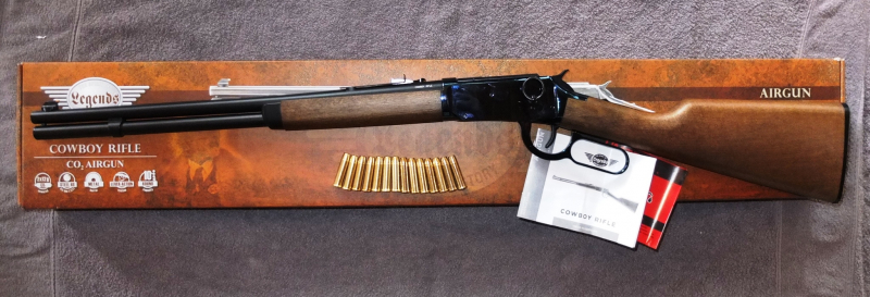Einer Western-Waffe nachempfundenes Unterhebel-Repetiergewehr mit authentischer Mechanik für 12g CO2 Kapseln. Es können 10 Ladehülsen mit 4,5mm Stahl BB Kugeln geladen werden. Wie bei dem Vorbild werden die leergeschossenen Ladehülsen beim Repetieren ausgeworfen und können dann wieder verwendet werden. Zustand: wie neu, wurde ohne Kugeln durchrepetiert – funktioniert. Zustand siehe auch Fotos. Mit original Verpackung, Bedienungsanleitung und 14 Ladehülsen.