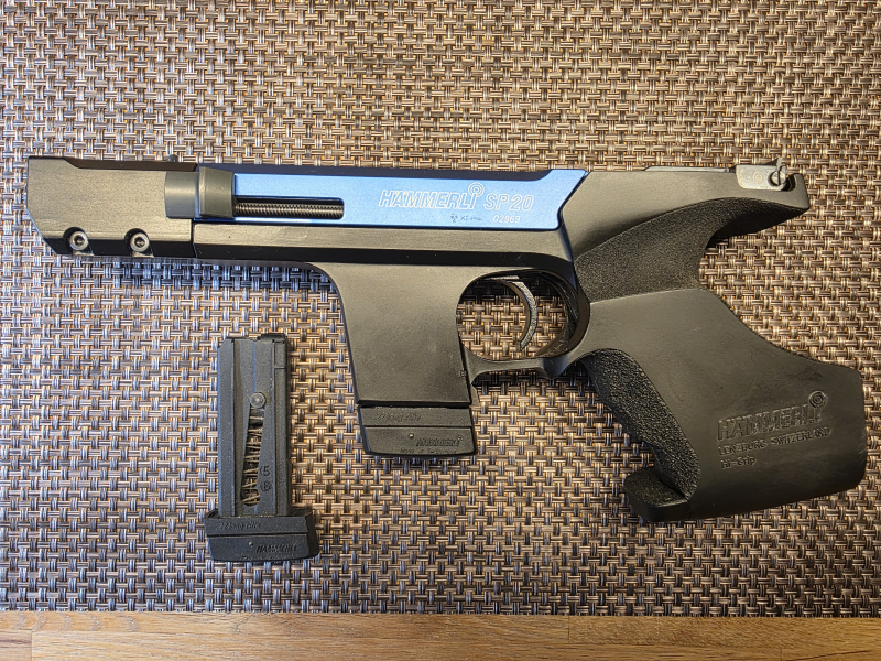 Es handelt sich um eine Hämmerli SP20 in blau mit Rechtsgriff, Kaliber 22lfB. Die Waffe ist in einem TOP-Zustand, wenig geschossen, 2 Magazine, Klappkorn. Da ich ausschließlich nur noch BdMP Diszipline schieße liegt die Waffe geputzt im Tresor.