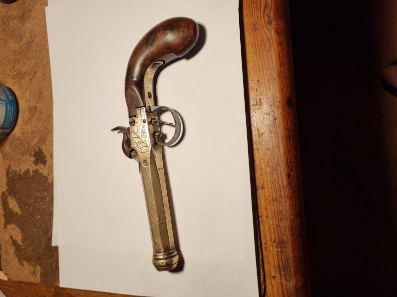 Marine Pistole- Messing/Bronze. Cal. 13mm, Gemarkt Lüttich. Hahn geht in zwei Stufen.