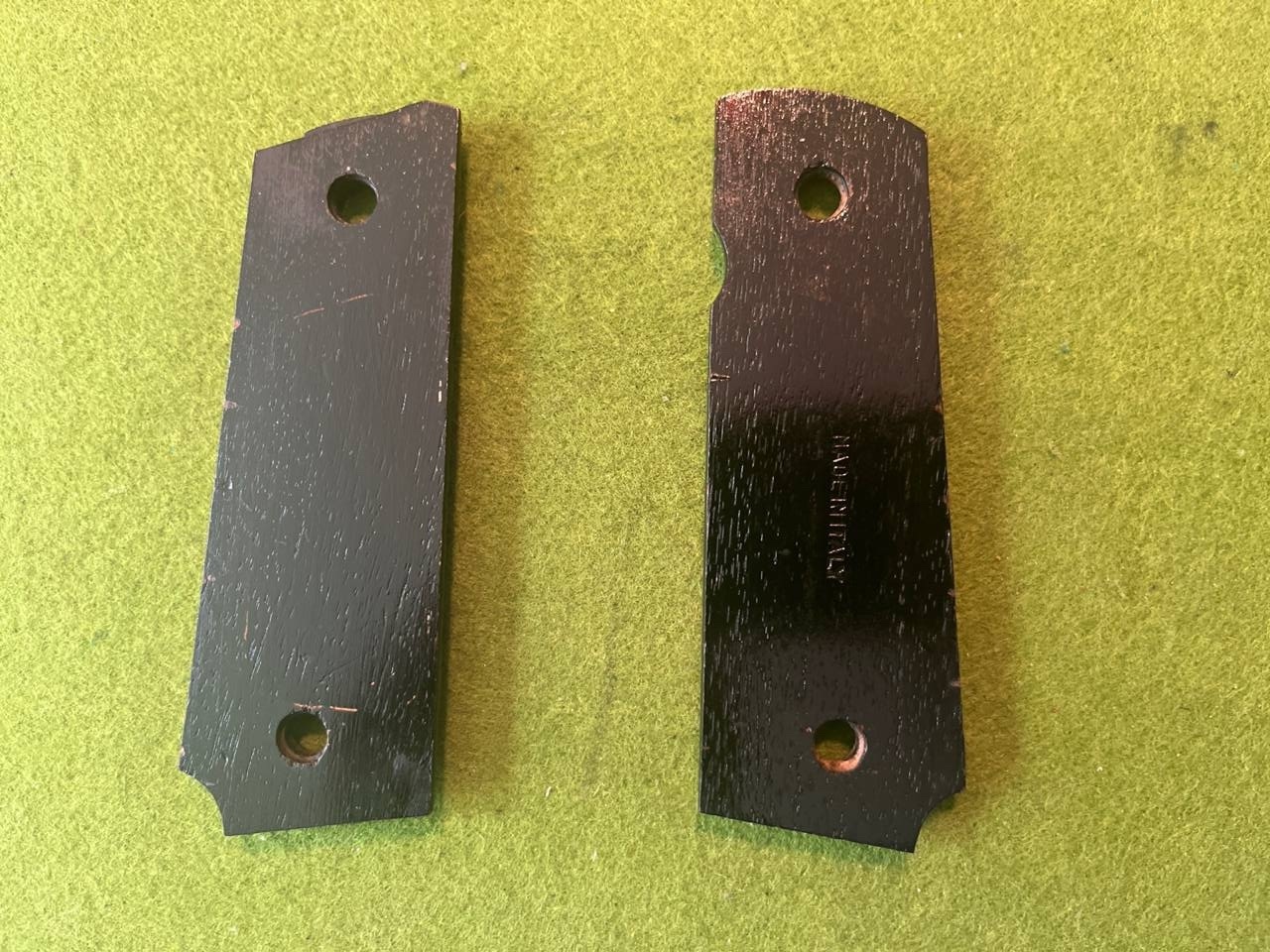 aus schönem, lackierten und bemusterten Edelholz, offensichtlich für die im Auktionstitel angegebene klassische Waffe/n, ein Beispiel aus dem Netz habe ich nicht gefunden, die Griffe sind aber auch für die meiste Klonen/Nachbauten der Colt 1911 wie z.B. Norinco