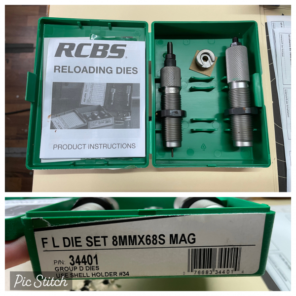 RCBS Matrizensatz 8x68S Magnum (RCBS Artikelnummer #34401) inklusive RCBS Hülsenhalter. Es wurden nur etwa 100 Patronen damit geladen.