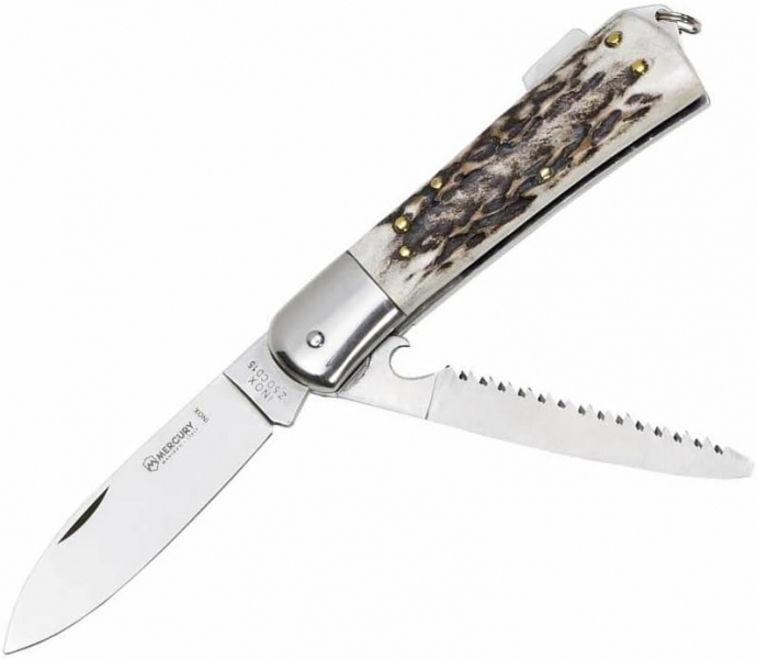 Mit Schneideklinge und Säge. Die Klinge ist aus 1.4116 rostfreiem Stahl mit einer Rockwellhärte von 54-56° und wird durch das klassische Lockback festgestellt.