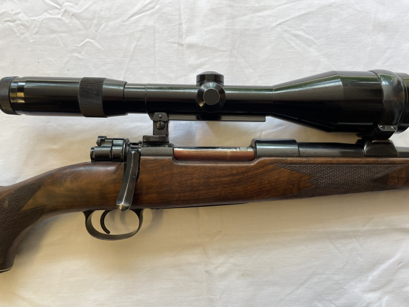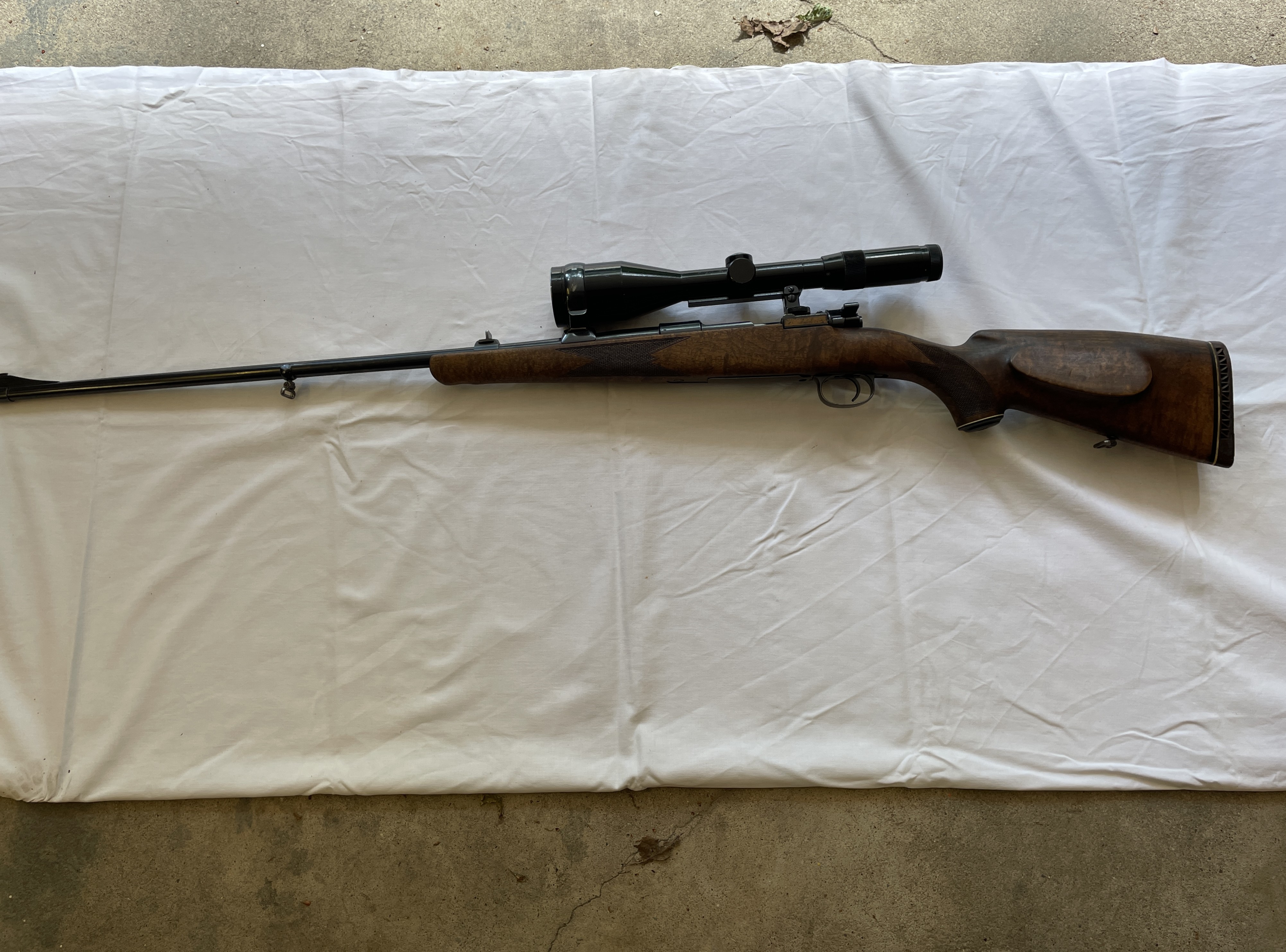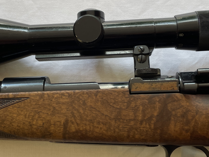 Zum Verkauf kommt eine Rep.-Büchse Fa. Hartmann und Weiss im Kal. 8x68S. Auf der Waffe ist mit einer SEM ein ZF Nickel 3-12x56 Abs. 4 mit Leuchtpunkt montiert. Der 71cm lange Lauf hat eine Visierung. Das System ist 98er mit Flügelsicherung und Flintenabzug. Der Kammerstengel ist flach und Enganliegend. Magazin ist von Oben zu laden. Gesamtlänge 123cm, Schaftlänge 35,5cm, Glas 28cm. Der Schaft besitzt eine Gummi-Kappe, Backe, Fischhaut und Riemenbügel. Der Lauf ist blank, Brünierung noch gut. Verkauft wird nur gegen Vorlage einer gültigen Erwerbsberechtigung (EWB) und Vorlage der NWR ID-Nr.: P + E!
