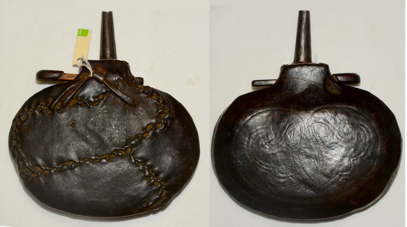 Afrikanische Pulverflasche, Holz mit Lederüberzug, Größe das Korpus ca. 18x15x5cm, Vorderseite leichtes Prägemuster, guter Zustand ohne Mängel, leichte Gebrauchsspuren, Ende des 19. bis Anfang des 20. Jahrhunderts