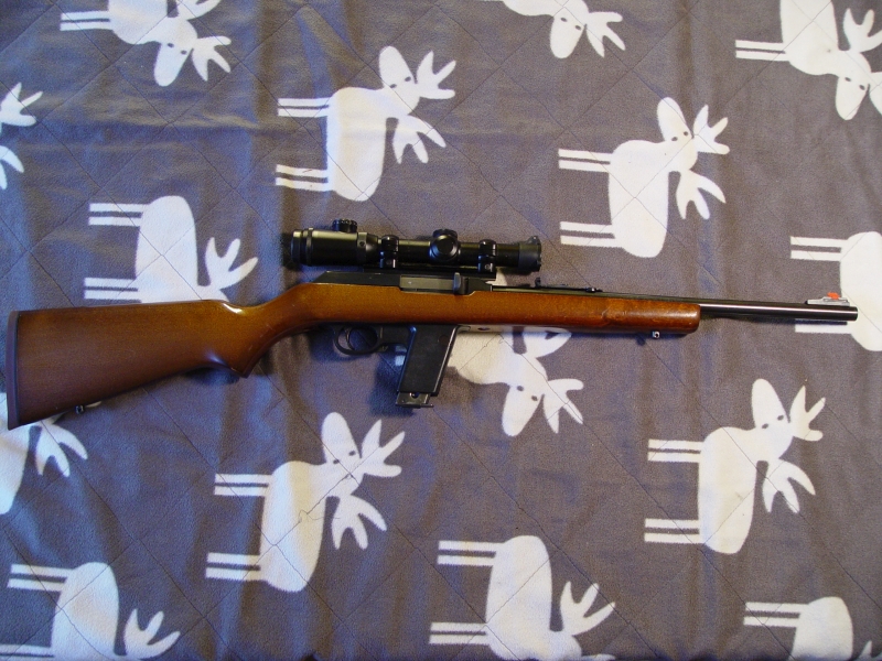 Guter gebrauchter Selbstlader Marlin Camp Carbine mit Holzschaft. Model 9 im Kaliber 9 mm Parabellum / 9 mm Luger / 9 x 19 mm. Kurz und führig bei Gesamtlänge rund 90,5 cm. Schießt dafür ordentlich präzise. Mit montierter Schiene, darauf ein älteres MicroDot Zielfernrohr 1,5 bis 4,5-fach mit Leuchtpunkt auf Festmontage (1“ Tubus), Butler Creek Flipdeckel. Wohl After Market-Magazin mit Kapazität 10 Schuss.