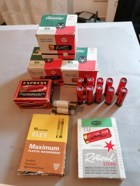 48 X Hubertus 2,5mm, 25 X Hubertus 3mm, 10 X Gecco Express 3mm, 9X Rottweil Stern 2,5mm, 8X Eley 2,5mm, 10X Gustav Genschow Express, 3X Flintenlaufgeschoss aus Nachlass.