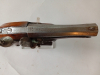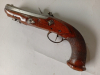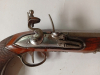 Kanone mit Facetten, leicht tromblonné an der Mündung, graviert. Platine und Hahn mit rundem Hals. Beschläge und sechseckige Kappe aus graviertem Eisen. Griff aus Walnussholz, teilweise kariert. Holzschaft. Länge: 23 cm, Länge der Kanone: 11,5 cm.