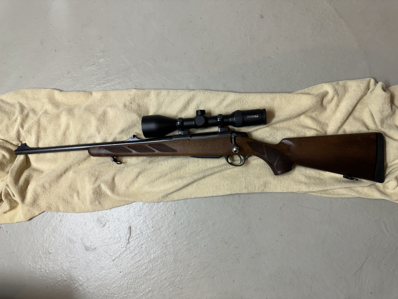 Verkauft wird eine Gebrauchte Repetierbüchse Tikka T3 Hunter (Links) im Kaliber .30-06 Spr., 51 cm Lauf, mit fester Montage und montiertem Steiner Ranger 4 Zielfernrohr 3–12×56 mit Leuchtabsehen 4A-I.