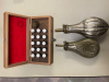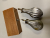 Biete zwei Pulverflaschen aus Neusilber 13,5 cm und 17cm Länge ohne Pulverauslauf. Die Flaschen wurden benutzt und sind aus den 80er Jahren. Dazu eine Holzbox mit Messingtrichter und Pulverröhrchen wie abgebildet.