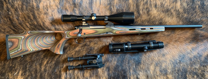 Ausgestattet mit einem Schmidt & Bender 8x56 für den Ansitz und einem Kahles Helia L 1,1 - 4,5 x 20 für die Drückjagd und einem passendem Zweibein.