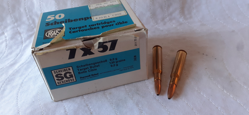 Aus einem Jägernachlass werden 42 Stück Patronen 7x57 Scheibenpatronen SG-Geschoss 9 gramm angeboten . Der Verkauf erfolgt von Privat ohne Garantie/Gewährleistung und Rücknahme .