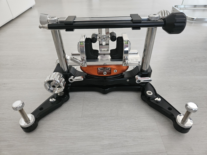 Equipped with a carrying handle on top. The joystick and driver are attached to the carrying handle (with a pair of clip-on Delrin) for more organized storage. This also reduces the risk of losing or forgetting to bring both handles. It is also safer to transport the rest as the tips of the leveling screws point toward the ground. When rotated toward the shooter's side (either side), it can be used as a cartridge holder, tablet holder, or spotting scope holder, with a small modification or extension.