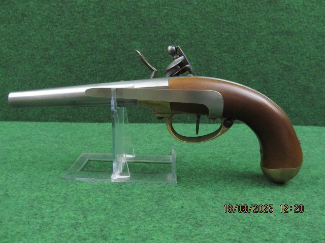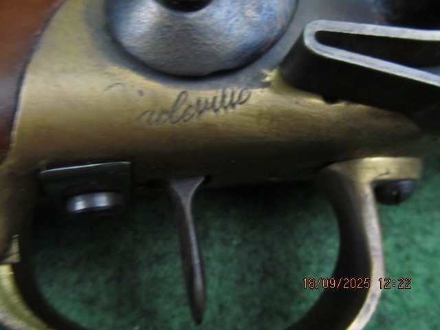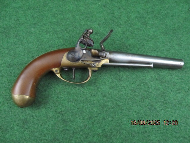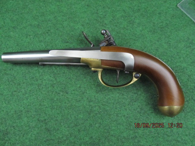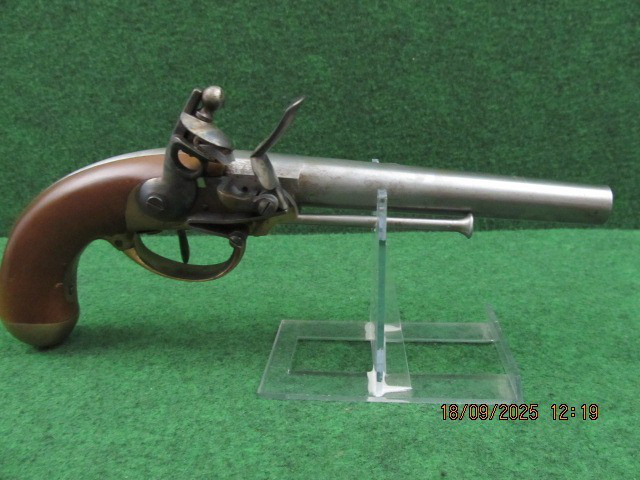 Sie bieten hier auf eine Steinschlosspistole Kal. ( Mündung: ca: 17mm, 0,68“) Made in Italy Ladestock.
