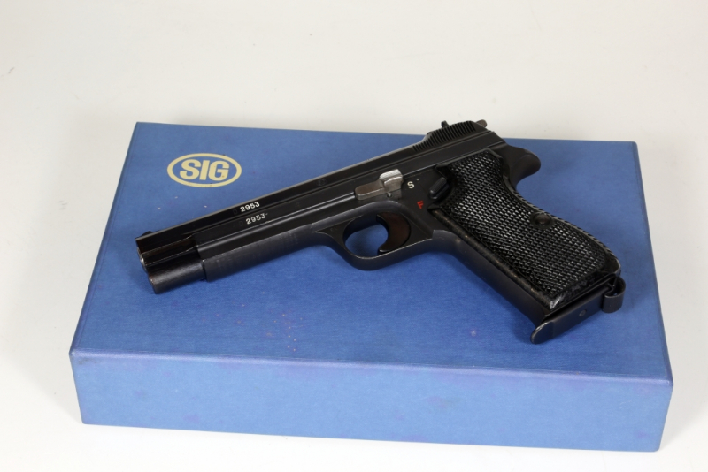 SIG P 210 – 4, Kaliber 9mmLuger, 1951 für den BGS (Bundesgrenzschutz) eingeführt. Vierstellige Seriennummern beginnend mit einem "D". Besonderheit: mit oben liegendem Ladestandsanzeiger, den gab es nur bei der deutschen Ausführung. Insgesamt wurden von Deutschland 5000 Stück bestellt. Nummerngleich und Korrekte Griffschalen ohne Aussparung für Fangriemenöse. BMI-Stempel auf dem Abzugsbügel In diesem Zustand heute sehr selten zu bekommen. Als die waffenverkauft wurden, vielen viele in die Hände von Sportschützen, die sie dann modifizierten, eine verstellbare Sportvisierung und andere Griffschalen anbrachten und den Abzug veränderten. Diese hier ist im originalem Zustand und eine echte Sammlerwaffe. Der hier angebotene gebrauchte Gegenstand wird ausdrücklich von privat unter Ausschluss jeglicher Gewährleistung verkauft. Rückgabe ist ausgeschlossen. Wer damit nicht einverstanden ist, möge auch nicht mit bieten. Vorherige Besichtigung ist möglich – Nachverhandeln jedoch ausgeschlossen. Kein Versand ins Ausland.