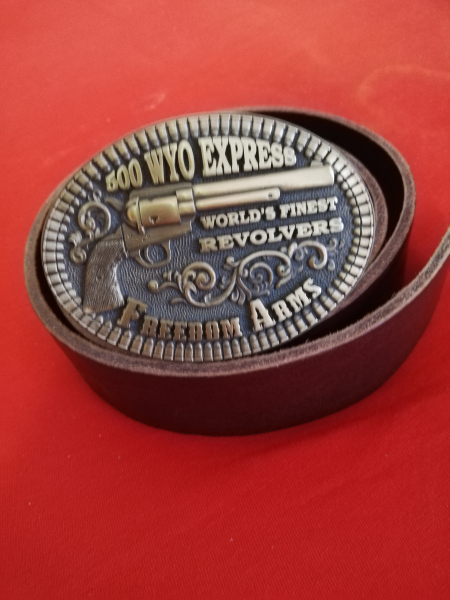 Schönes absolutes neuwertiges Buckle von Freedom Arms 500 Wyoming Express. Dazu exelenten stabilen Rindsledergürtel Gesamtlänge 1.25 cm ,erstes Loch 97.0 cm letztes 107.0cm breite 4cm u. dick 5mm . Farbe dunkelbraun. Gürtel kann auch problemlos gekürtzt werden.Keine Rücknahme.