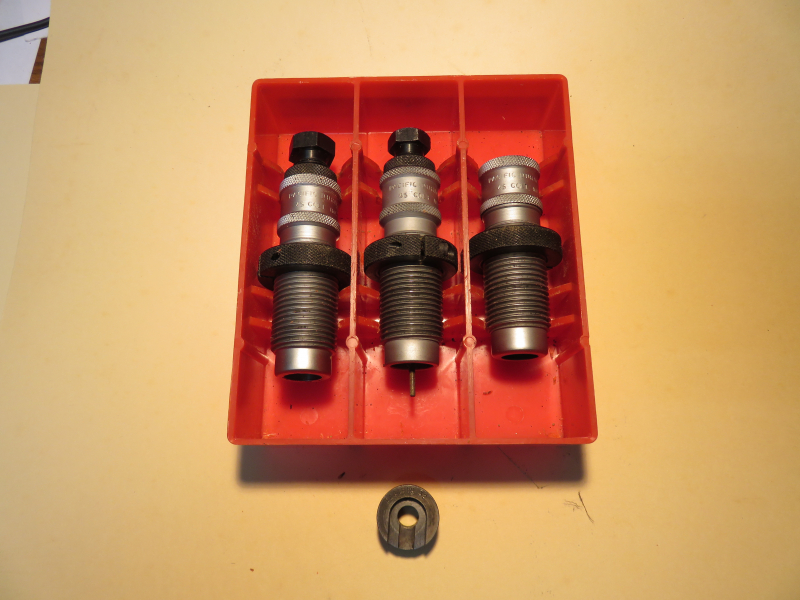 Verkauft wird ein Matrizensatz Cal. 45 Long Colt incl. Hülsenhalter. Hersteller Pacific Durachrome Dies