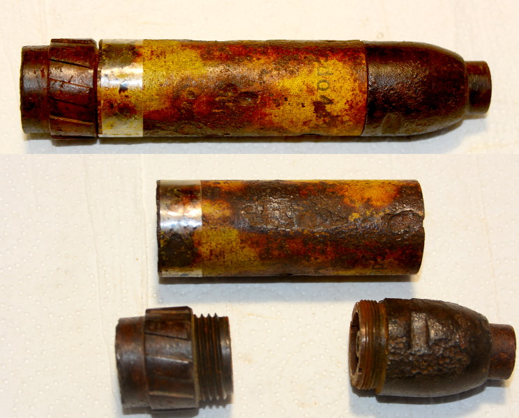 Deutsche Gewehrgranate 2. Weltkrieg, Bodenfund mit Rostschäden, markiert "cdo 44" (Theodor Bergmann Waffen- und Munitionsfabrik Werk Bernau), vollständig entschärft
