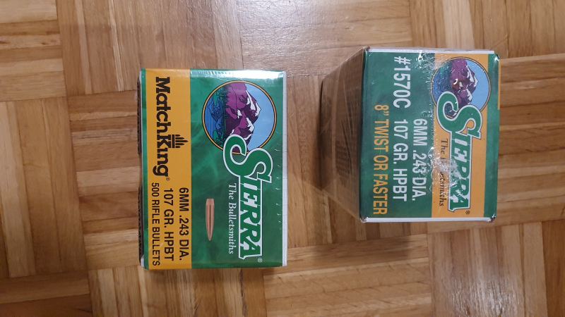 Verkaufe 500 Stk Sierra Geschosse Kal. 6mm/.243" 107gr Matchking ,# 1570 für NormaBR, Dasher, 6XC, Creedmoor. Neueste Fertigung, Geschoss ab Werk gepointet, G1 BC .547, G7 BC .262 .Es sind insgesamt mehr da, auch 500 Stk mit Molybeschichtung,bitte anfragen. Verkauf weil nicht mehr benötigt. Egun ich Versand der Käufer. Keine Garantie,Umtausch oder Rücknahme. EU Versand ca. 15-20€.