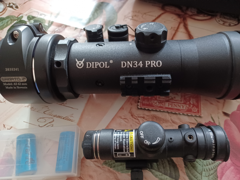 Zum Verkauf steht ein Vorsatz-Nachtsichtgerät Dipol DN34 Pro mit Laser-Aufheller. Schwarz- Weisses Bild,